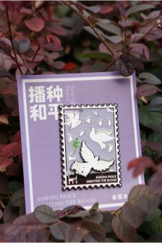 以和平鸽为主要元素,和平鸽衔着橄榄枝和紫金草,同时结合邮票的外观样式,象征着将和平的种子传播到世界各地,向全世界传递和平、友好和希望。
