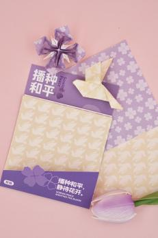 套装内包含印有和平鸽与紫金草图案的黄色、紫色折纸和教程,可以制作出展翅欲飞的和平鸽及栩栩如生的紫金草。