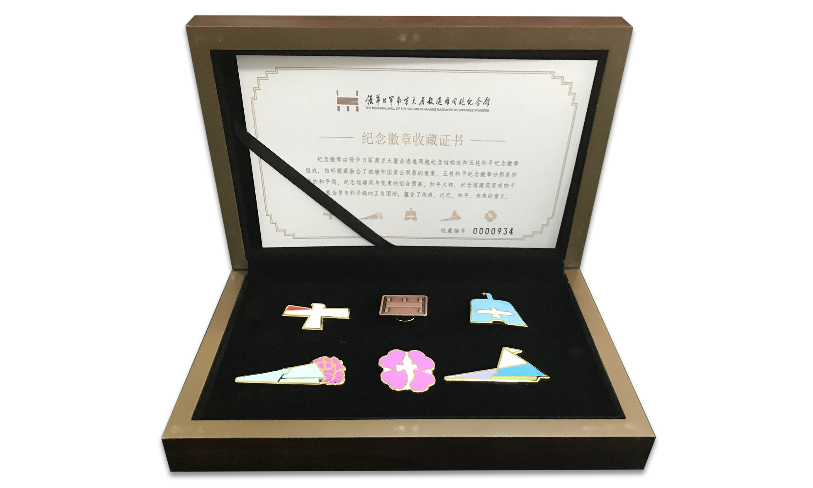 以纪念馆馆内建筑、雕塑为设计元素,对建筑造型、和平大钟、紫金草、和平鸽等进行再创作,以伤痕、记忆、和平、未来为主题,分别设计了折翼的和平鸽、纪念馆馆标、和平钟、纪念花束、紫金草以及千纸鹤6枚徽章,和平纪念徽章套装寄托了中日两国爱好和平人民的共同祈愿。