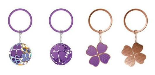 分别以紫金草图形为基础,设计球形及花瓣形钥匙扣,可爱实用,金属材质突显质感。