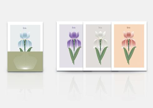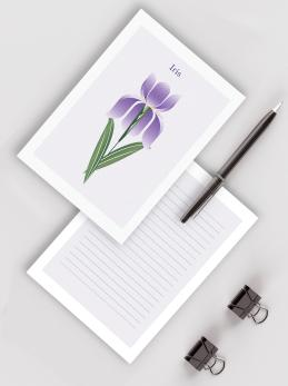 信纸的背面采用不同色彩的鸢尾花图案,包装封套用线条勾勒出花瓶造型,购买整套信纸时,仿佛是插在花瓶里的鸢尾花。