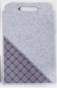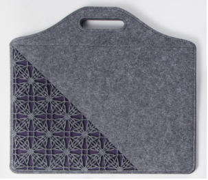 运用“和平之花”紫金草作为设计元素进行图案构成,选择羊毛毡为材料,横款采用激光雕刻的方式实现包面的镂空效果,并采用紫色内衬,显示出紫金草本身的颜色,竖款采用丝网印刷技术将图案转印在毛毡包的表面作为装饰。