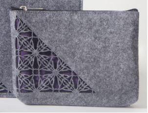 以紫金草作为设计元素进行图案构成,选择羊毛毡为材料,采用激光雕刻的方式实现包面的镂空效果,并采用紫色内衬,显示出紫金草本身的颜色。
