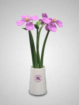 将紫金草的花朵花枝作为圆珠笔的造型,以花枝为笔身,末端是盛开的紫金花,摆在笔筒中仿佛花瓶中的一束紫金草鲜花。