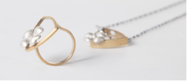 运用“和平之花”紫金草作为设计元素,2款分别为戒指、吊坠,材质为银质镀金。戒指作活口,可按手指粗细自由调节。