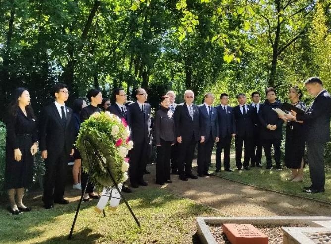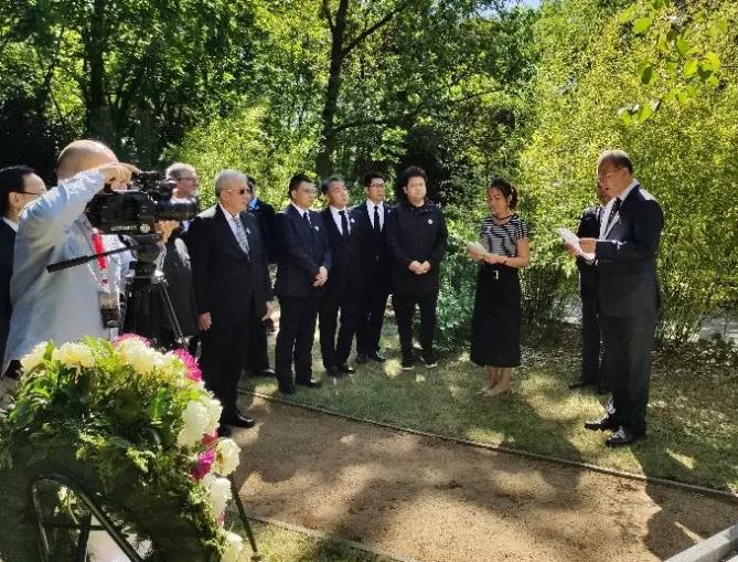 On the morning of July 4, Berlin time, Wang Yanwen, member of the standing committee of Jiangsu Provincial Party Committee and head of the publicity department, Chen Yong, member of the standing committee of Nanjing Municipal Party Committee and head of the publicity department, as well as Jiangsu provincial cultural delegation and the representatives of crew of the opera The Diaries of John Rabe, went to pay a visit to the cemetery of John Rabe with gratitude. Mr. Thomas Rabe, the grandson of John Rabe, was there with members of the Rabe Institute. Ling Xi, deputy curator of the Memorial Hall of the Victims in Nanjing Massacre by Japanese Invaders, also attended the ceremony.