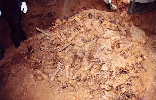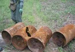 At 16:00 on August 4, 2003, workers dig out five rusted metal drums (75 cm high and 45 cm in diameter) at a construction site of Beijiang Garden, Airport Road, Longsha District, Qiqihar of Heilongjiang Province.