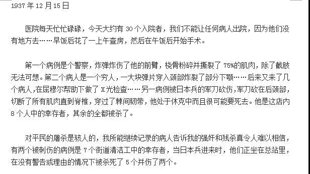 During the Nanjing Massacre, he was the only surgeon in the city. In the absence of water and electricity, he worked day and night to treat Li Xiuying and other Chinese refugees who had been shot, stabbed or raped by the Japanese army.