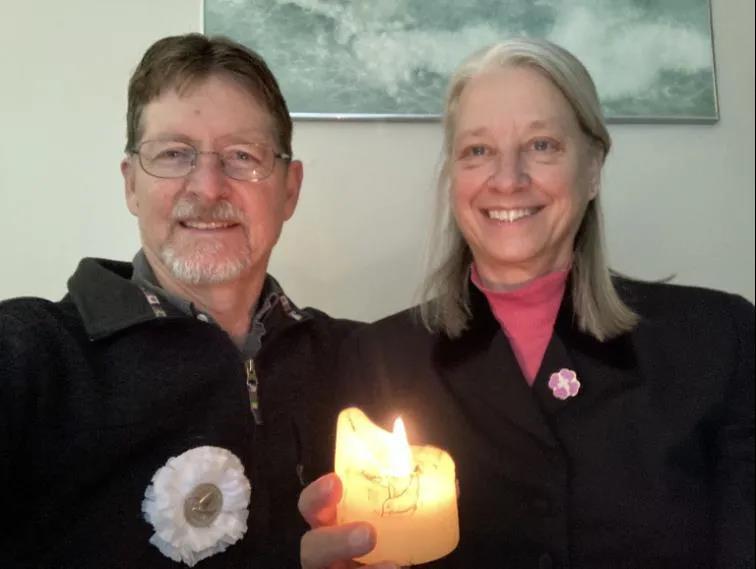 They are the grandson and great-granddaughter of Dr. Richard Brady who stayed at Drum Tower Hospital in Nanjing during the massacre. They were holding white candles to mourn the dead. "We are sending you thoughts of Love and Peace on this day and always." Stephen Brady wrote in an email.