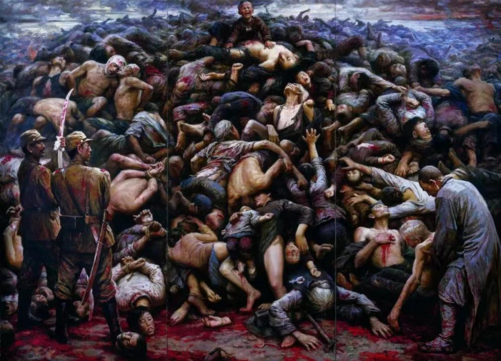 The oil painting is 3.2 meters wide and 2.1 meters high. As its names suggests, the painting consists of three parts, “slaughter”, “rebirth” and “Buddha”. The left part, “slaughter”, shows two Japanese soldiers standing with a smile and one of them rubbing blood off the sword after a beheading contest; the middle part, “rebirth”, shows a child crying on a pile of dead bodies, including that of his mother; the right part, “Buddha”, depicts a monk carrying a dead old man. The main part of the painting is the mountain of corpses. The shape of the mountain is an indication of the irrefutable evidence of the crime committed by the Japanese troops in the Nanjing Massacre. Behind the corpses is the running Yangtze River.
