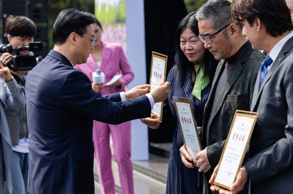 Zhou Feng, deputy director of the Publicity Department of the Communist Party of China Nanjing Municipal Committee and director of the Memorial Hall, awards a certificate to Zijin Cao cultural exchange ambassadors