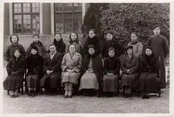 A group photo of Minnie Vautrin (fourth from left, front row) and some staff of the refugee camp at Ginling College