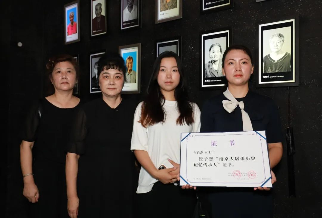 Born in 1999, survivor Huang Guilan’s great-granddaughter Tao Xinyi is the youngest inheritor granted a certificate this time. Tao is studying at Nanjing University of the Arts and often talks about the history of the Nanjing Massacre with her schoolmates. “I major in display design. I often visit the Memorial Hall together with my schoolmates. At the Memorial Hall, I not only observe how the exhibits are displayed, but learn about this history. As the descendant of a survivor, I have the responsibility to pass down the historical memories.”