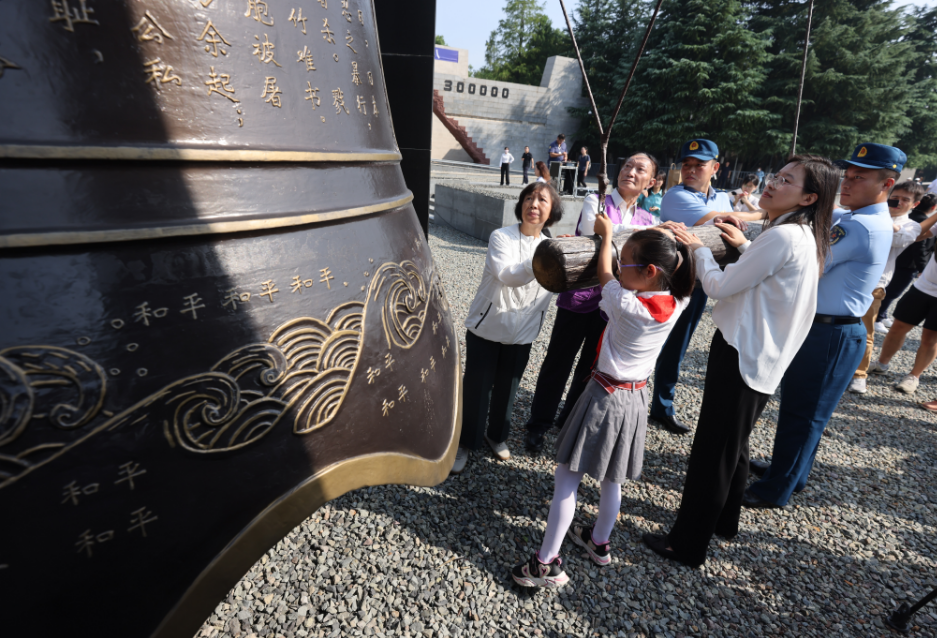 At 9:25, the ceremony of striking the Bell of Peace started. Six representatives jointly struck the bell three times. They may be a representative of the descendants of Nanjing Massacre survivors, a teenager, a teacher, a military officer or soldier, or a Zijin Cao volunteer. The sound of the bell reminded people of the importance of remembering history and cherishing peace.