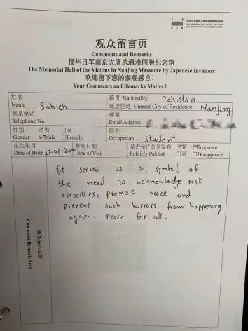During the Mid-Autumn Festival and National Day holiday, the Memorial Hall received about 200,000 visitors. Of them, 730 were foreigners from the Republic of Korea, Japan, and other countries and regions. Sabieh from Pakistan left a message before leaving. “It serves as a symbol of the need to acknowledge past atrocities, promote peace and prevent such horrors from happening again. Peace for all.” Sudeepti Mundirinti from India and Gandhish Irvidhesh Singh from Mauritius are students at Nanjing Medical University. They have been studying and living in Nanjing for five years. Sudeepti Mundirinti was very shocked when she first learned about the history of the Nanjing Massacre from a Chinese classmate. On October 5, they visited the Memorial Hall for the second time, and had a more thorough understanding of that history. “Why fight at all?” they sighed during their visit.