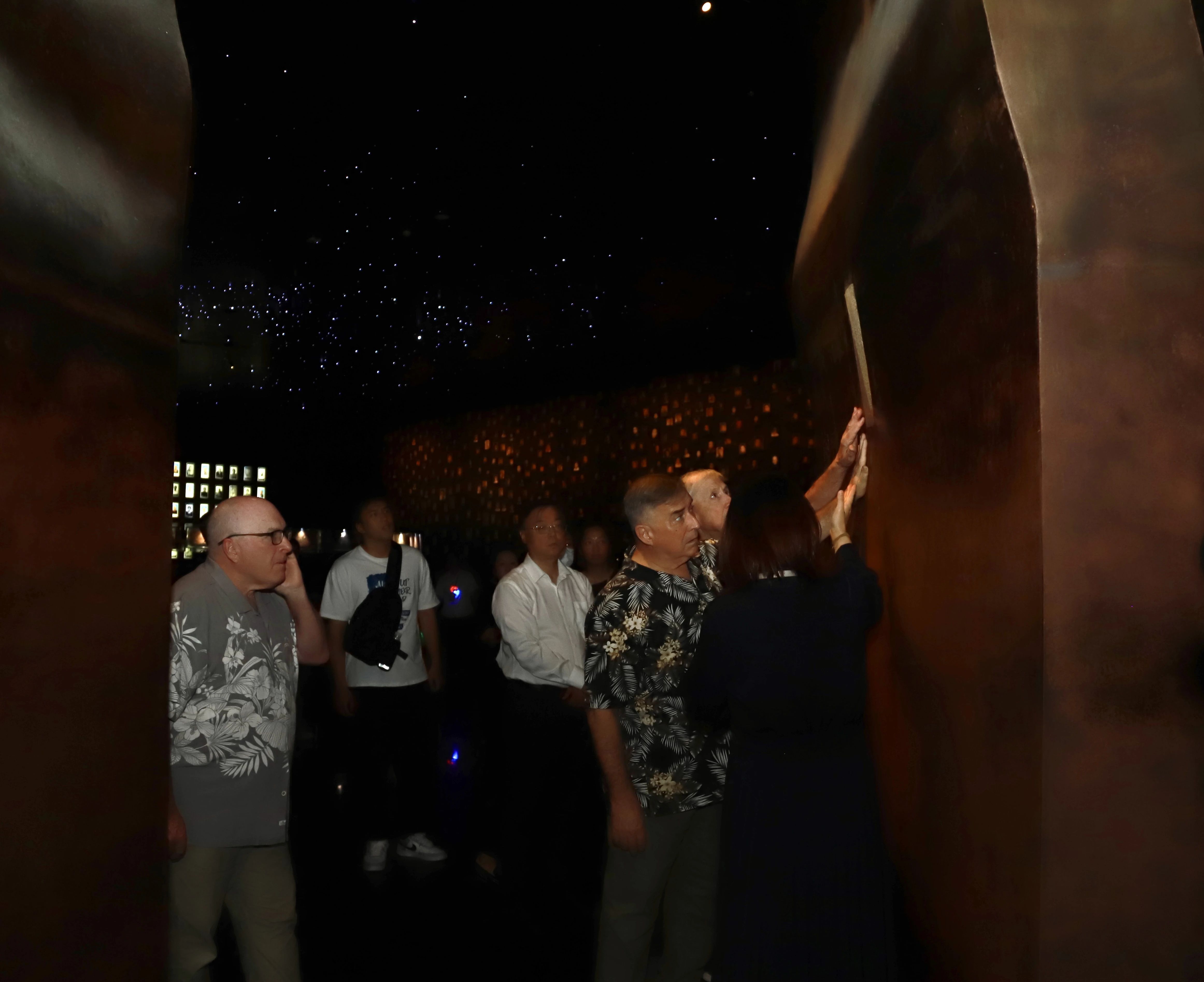 During their visit, the Flying Tigers delegation, led by an educational officer from the Memorial Hall, toured the Nanjing Massacre Exhibit. The delegation members solemnly examined each artifact, carefully verifying details with the educational officer. Upon seeing the tall, twisted gates of Nanjing, still bearing visible bullet holes, Jeffrey Greene, Chairman of the Sino-American Aviation Heritage Foundation, reached out to touch the scars of war on the city walls, lamenting the destruction inflicted on Nanjing.