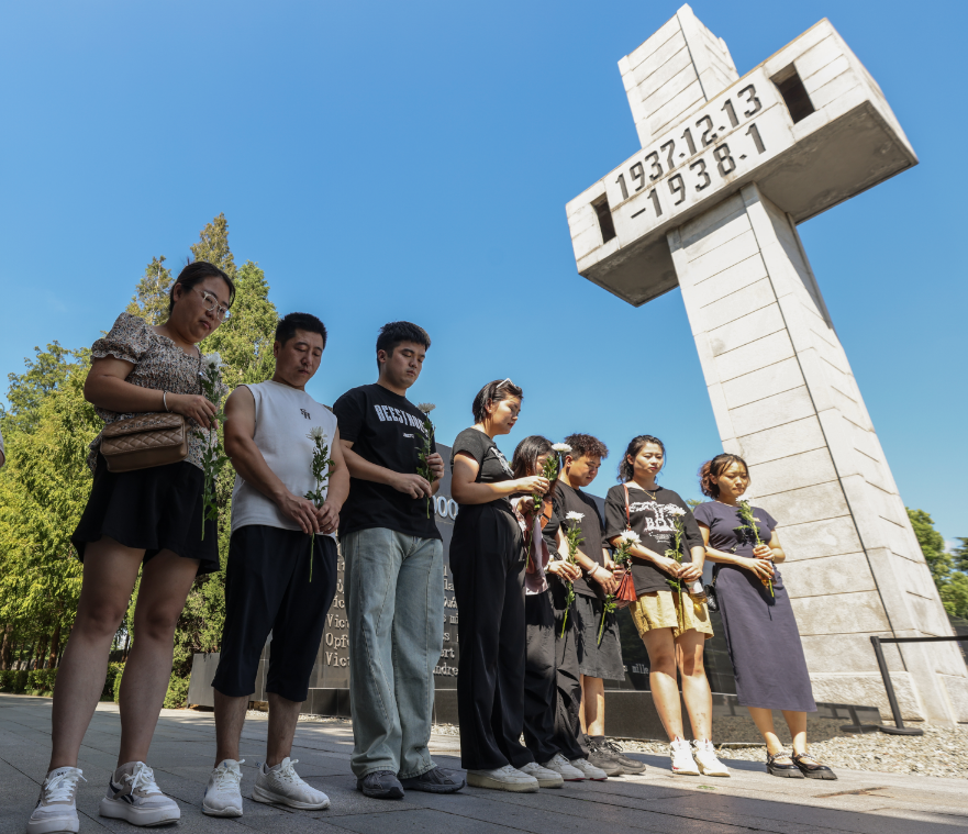 At 10 am, air-raid sirens sounded across Nanjing. At the Public Memorial Square of the Memorial Hall, visitors paused to reflect and mourn the deceased.