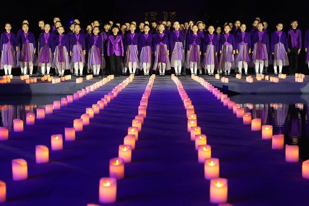 "We will continue to light the spark of peace. Just as the morning star dispels the shadows of darkness, dawn will come, bringing a warm glimmer of light, uniting our shared wishes into an immortal force..." On both sides of the stage, the children of the Zijin Grass Art Troupe's Children's Choir held candles in their hands, presenting for the first time their specially composed original song Peace Blowing Over Zijin Grass, using music to memorialize and soothe the hearts of the people, and conveying the prayers for peace.