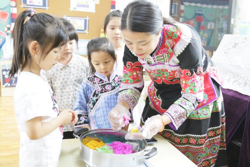 坚持丰富载体,把铸牢中华民族共同体意识贯穿立德树人全过程。在教学方案设计中,根据幼儿年龄特点,活泼好动、形象化思维活跃,在寓教于乐中融入中华传统文化元素,创设“民族美食、服饰分享会”“国旗下讲话”“民族大联欢”、56个民族人物水彩画展等课程。在传统节日邀请家长参与,举办“闹元宵” “庆端午” “过中秋”等特色亲子活动,让幼儿初步形成铸牢中华民族共同体意识,让中华优秀传统文化的种子从小厚植于小朋友心中,伴随他们一起茁壮成长。