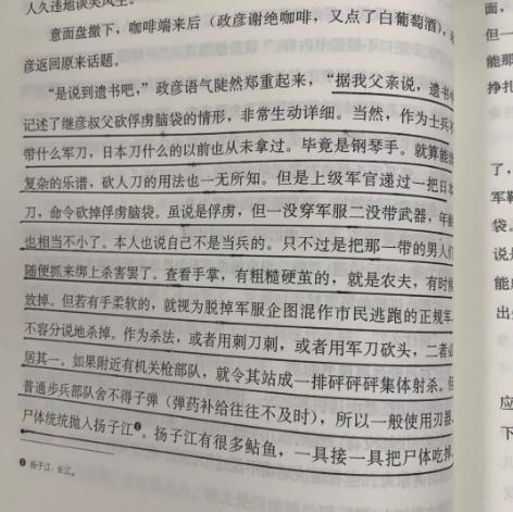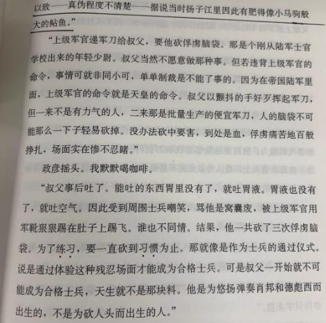 「いずれにせよその父の回想は、軍刀で人の首がはねられる残忍な光景は、言うまでもなく幼い僕の心に強烈に焼きつけられることになった。ひとつの情景として、更に言うならひとつの疑似体験として。言い換えれば、父の心に長いあいだ重くのしかかってきたものを――現代の用語を借りればトラウマを――息子である僕が部分的に継承したということになるだろう。」