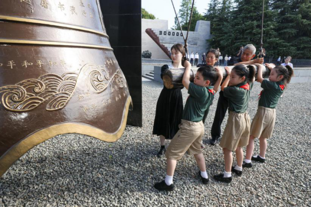 8時15分、平和の鐘を鳴らす式典が記念館公祭広場で行われた。南京大虐殺生存者の子孫6人と南京市青少年の代表が、平和の鐘を鳴らした。鐘の音が広場の上空に長く響き渡り、常に歴史を記憶し、歴史の真実を守り、民族の尊厳を守り、平和と正義を守ることを人々に告げたい。