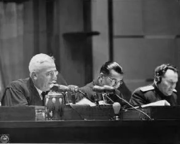中国の梅汝璈裁判官(中)が裁判官席にて