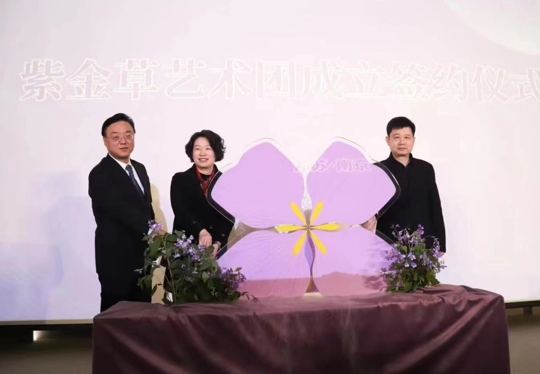 仪式现场,南京市妇女联合会主席吴曦,中共南京市委宣传部副部长、纪念馆馆长周峰,南京市教育局一级调研员卢普新共同启动装置,紫金草艺术团正式成立。
