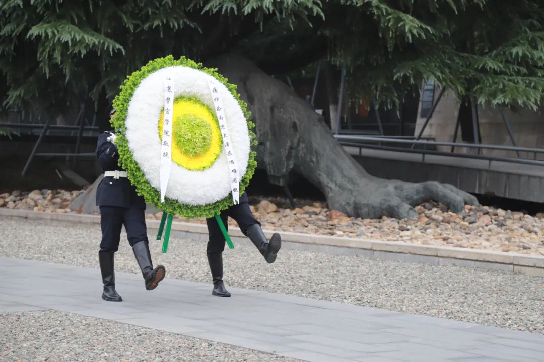 8时45分,在“古城的灾难”墙前,悼念仪式开始。全体肃立,学生代表周骥、李今博向南京大屠杀死难者敬献花圈。