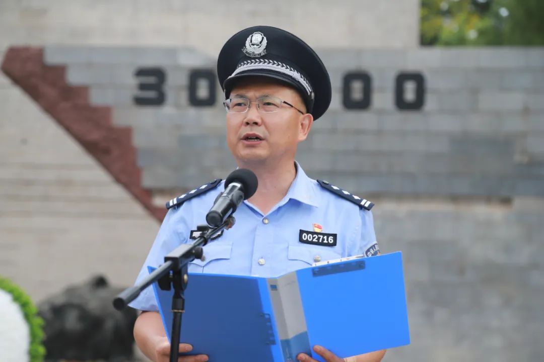 江苏警官学院学生处副处长温开殿发言。他说:“希望同学们珍惜今天参观学习的机会,认真接受现场沉浸式爱国教育,用心聆听,用情感悟,深刻领会国家安全和繁荣富强的重要意义,深切体会和平生活的来之不易。”