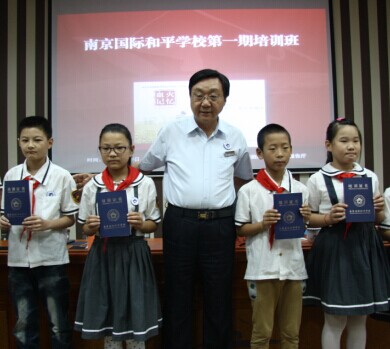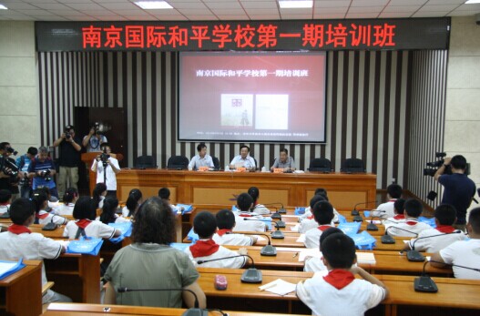 南京国际和平学校第一期培训班开班仪式,今在本馆学术报告厅隆重举行。江苏省外宣办副主任、纪念馆馆长、南京大屠杀史研究会会长、南京国际和平研究所所长朱成山研究员,南京市文化与历史研究所原所长、南京市社会科学院国际和平研究所副所长赵德兴研究员,以《南京大屠杀死难者国家公祭读本》(小学版)、《和平学概论》为题,深入浅出地向学生普及大屠杀历史及和平学知识,并向学员颁发毕业证书,来自江东门小学的36名同学,成为南京国际和平学校的第一批毕业学员。