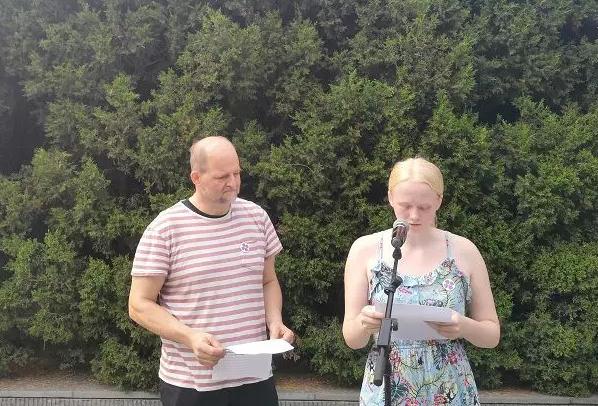 约翰·拉贝的第五代安吉丽娜·莱因哈特今年16岁,她是克里斯·莱因哈特的养女。她代表营员们发言:“两年前,父亲从南京回国,把在南京的所见所闻和这段历史讲给我听。曾外祖父约翰拉贝先生曾经说过:‘好事需相让,恶事莫相推’,这句话影响着我们家庭。我们家庭一直在接纳、照顾逃难到柏林的难民。”