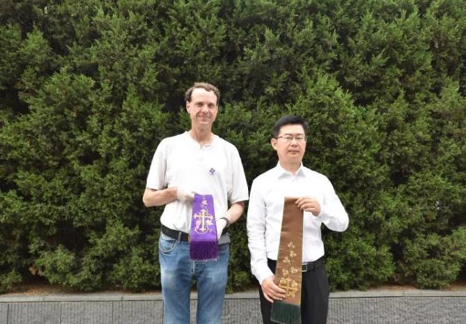 去年12月13日《历史·和平·发展——马吉祖孙的南京影像》展在我馆开展,展览中展示了一份珍贵的展品——两条约翰·马吉牧师当年在中国布道时使用的“圣带”,这是远在苏格兰的约翰·马吉之子休·马吉先生提供的。展览结束后,约翰·马吉的孙子瑞克·马吉将这两条“圣带”捐赠给我馆。时鹏程副馆长向瑞克·马吉先生颁发捐赠证书。