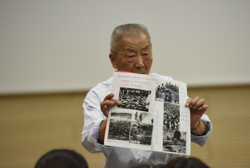 为了让学员们更加深刻地理解那段历史,南京大屠杀幸存者葛道荣老人来到纪念馆,与同学们面对面交流。葛道荣老人讲述自己的亲身经历,还向同学展示自己收集的与南京大屠杀有关的资料。老人说:“我们要记住历史,珍惜和平。”