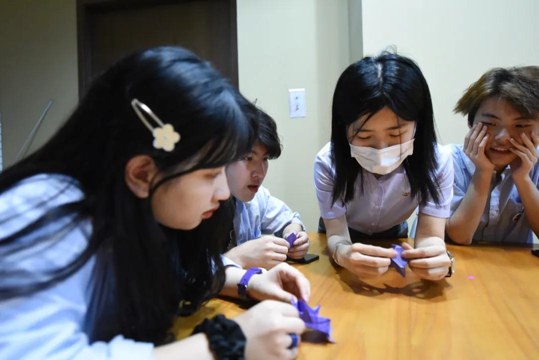 中午,他们跟随我馆工作人员动手折叠和平之花紫金草,一张张紫色纸片就变成了一朵朵象征和平与希望的紫金草。