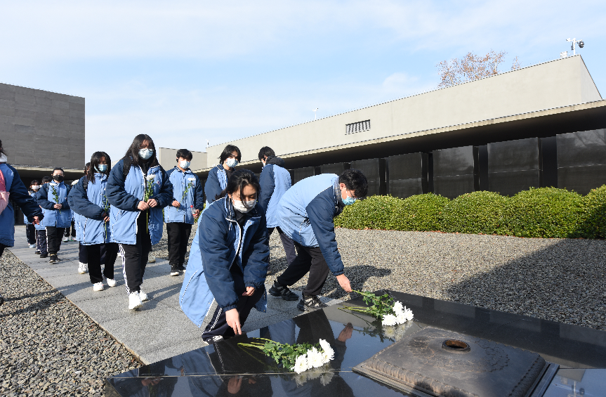 撞钟仪式结束后,他们参观了《南京大屠杀史实展》,近距离“触摸”历史,感悟和平。随后,同学们来到祭场,向遇难同胞敬献菊花。
