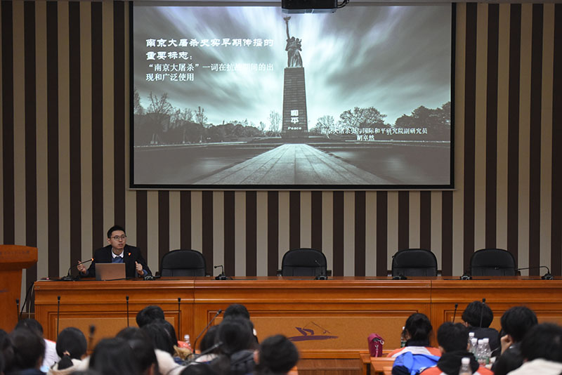 “我是朱烨璠,下午一点半,我们在学术报告厅听了南京大屠杀史与国际和平研究院专家胡卓然老师的授课——《南京大屠杀史实早期传播的重要标志:‘南京大屠杀’一词在抗战期间的出现和广泛使用》。胡老师梳理出了‘南京大屠杀’从舆论之中萌生,到被公开发布,一直延续到被固定使用的历史过程。让我们知道了日寇在南京犯下的罪行从一开始就被中国和世界知晓,这是无论什么时候都不容抵赖的事实。