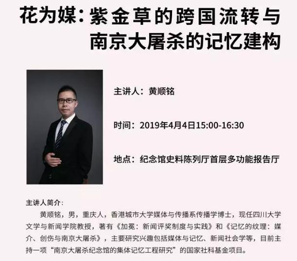4月4日(本周四)下午3点,紫金草和平讲堂第三期将在我馆史料陈列厅首层多功能报告厅开讲。本期讲堂特邀四川大学文学与新闻学院教授黄顺铭主讲《花为媒:紫金草的国际流转与南京大屠杀的记忆建构》。