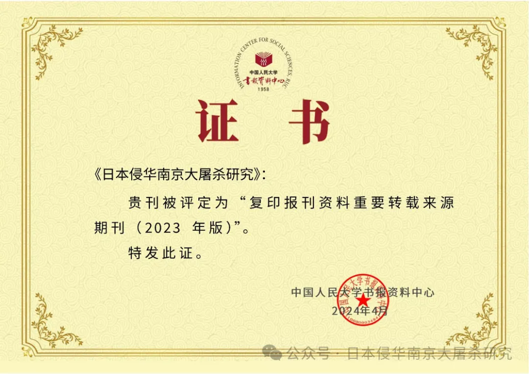 我馆《日本侵华南京大屠杀研究》入选“复印报刊资料重要转载来源期刊(2023年版)”