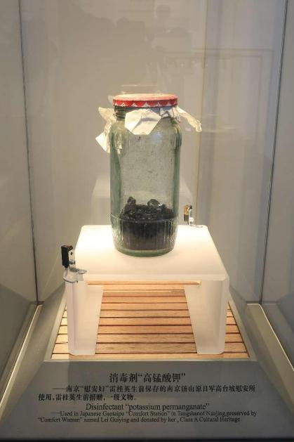 在南京利济巷慰安所旧址陈列馆的展柜里有一个玻璃瓶,里面装有一些暗紫色的结晶状物体,叫做高锰酸钾。这些高锰酸钾是南京日军“慰安妇”制度受害幸存者雷桂英老人生前捐赠给纪念馆的。高锰酸钾是一种强氧化剂,溶于水后变成紫红色,具有杀菌消毒的作用。