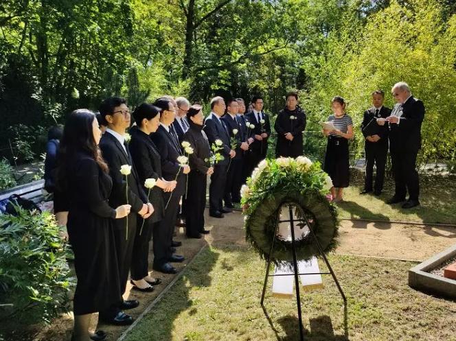 On the morning of July 4, Berlin time, Wang Yanwen, member of the standing committee of Jiangsu Provincial Party Committee and head of the publicity department, Chen Yong, member of the standing committee of Nanjing Municipal Party Committee and head of the publicity department, as well as Jiangsu provincial cultural delegation and the representatives of crew of the opera The Diaries of John Rabe, went to pay a visit to the cemetery of John Rabe with gratitude. Mr. Thomas Rabe, the grandson of John Rabe, was there with members of the Rabe Institute. Ling Xi, deputy curator of the Memorial Hall of the Victims in Nanjing Massacre by Japanese Invaders, also attended the ceremony.