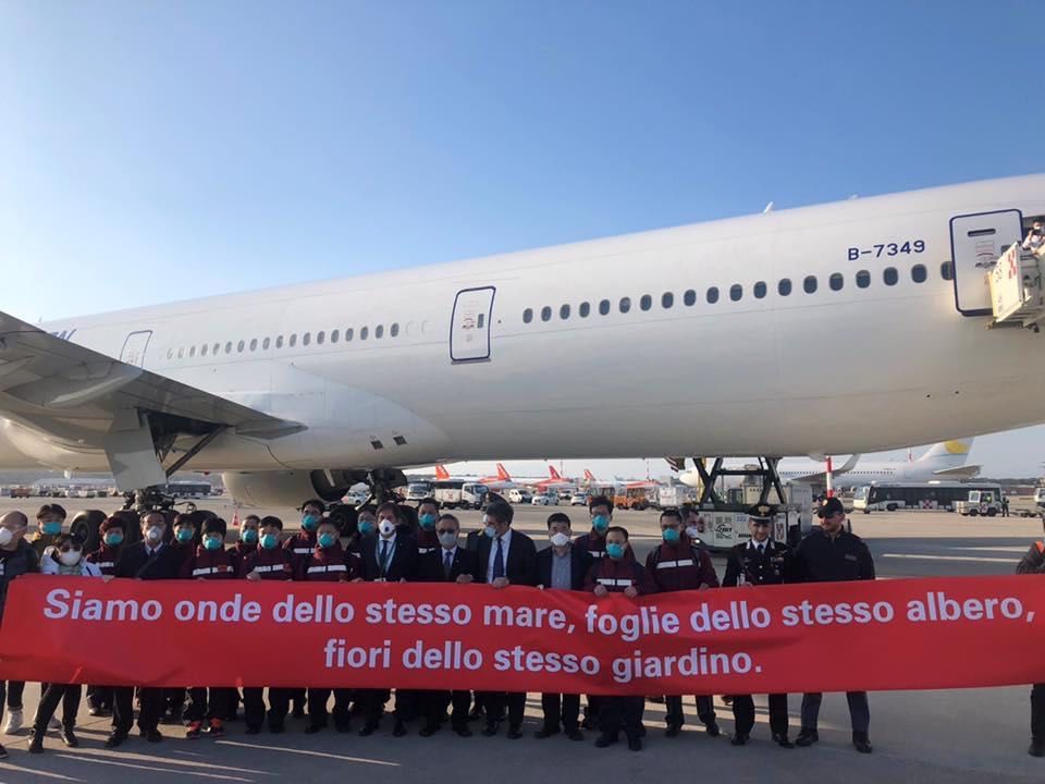 A group of 300 Chinese intensive care doctors arrived in Italy, with tons of medical supplies. The banner says: “We are waves from the same sea, leaves from the same tree, flowers from the same garden.” THANK YOU, CHINA.