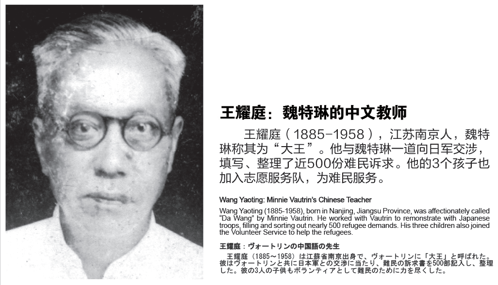 Wang Yaoting was a senior language teacher in Nanjing. He was also the Chinese teacher of Minnie Vautrin. Some Europeans and Americans in Nanjing called him “the best teacher in China”. During the massacre, Vautrin ran hither and thither on campus to drive away Japanese soldiers, and went to the Japanese Embassy many times to lodge a protest. Wang usually accompanied her wherever she went. In Vautrin’s eyes, Wang played an immeasurable role in many situations. On December 17, 1937, his family was taken away by the Japanese soldiers and wasn’t released until the next day. With great sorrow and helplessness, his hair turned grey in just a few months.