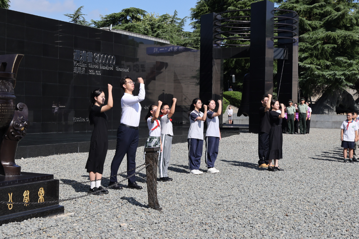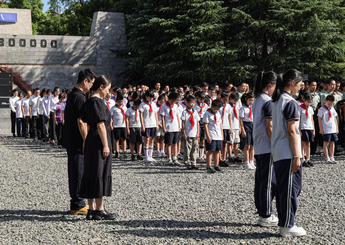 After the anthem, everyone observed a moment of silence in honor of the victims of the Nanjing Massacre, those who perished at the hands of Japanese invaders, revolutionary martyrs, national heroes, and international allies who fought alongside the Chinese people.
