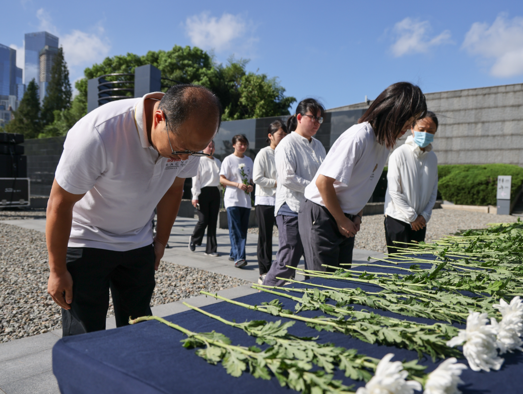 At 10 am, air-raid sirens sounded across Nanjing. At the Public Memorial Square of the Memorial Hall, visitors paused to reflect and mourn the deceased.