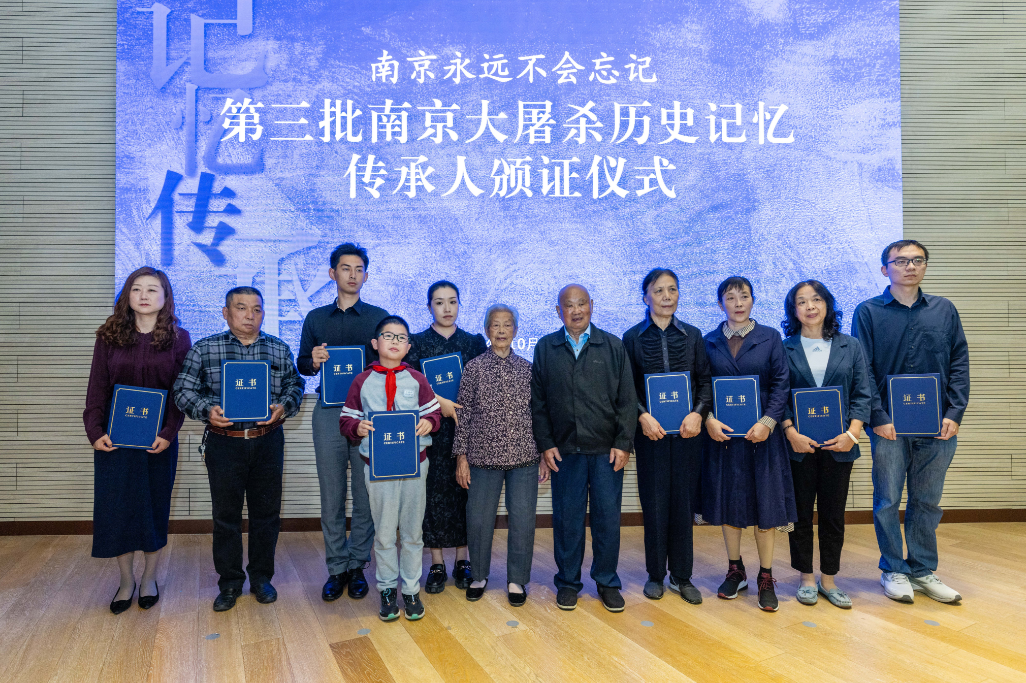 The Double Ninth Festival (Chongyang Festival) arrives year after year, and today marks its return once again. To commemorate the occasion, the Memorial Hall of the Nanjing Massacre Victims (by Japanese Invaders) held a ceremony to award certificates to the third batch of Nanjing Massacre Historical Memory Inheritors.Nine descendants of Nanjing Massacre survivors, including Cao Yurong, Wang Jinqin, and Chen Rong, received the certificates, officially becoming the "Historical Memory Inheritors of the Nanjing Massacre".