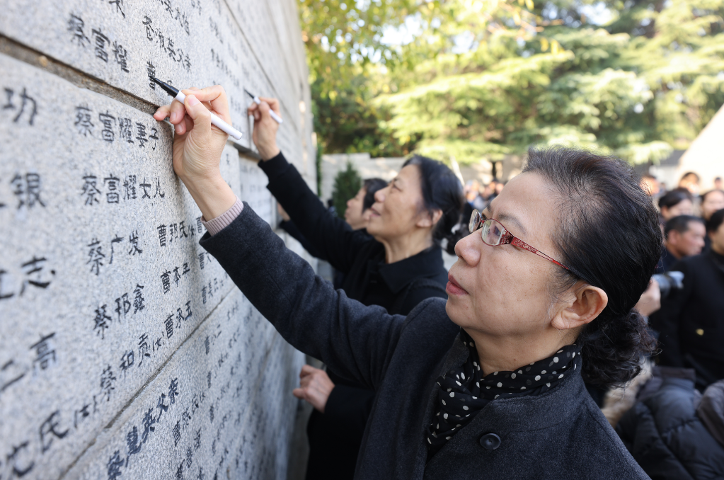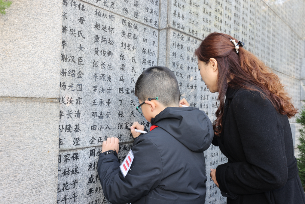 An increasing number of young people have voluntarily taken on the role of historical memory inheritors. Representatives of survivors' descendants, students, and others participated in “re-engraving” the names on the Wall of the Name List of the Nanjing Massacre Victims, an act of mourning and remembrance.