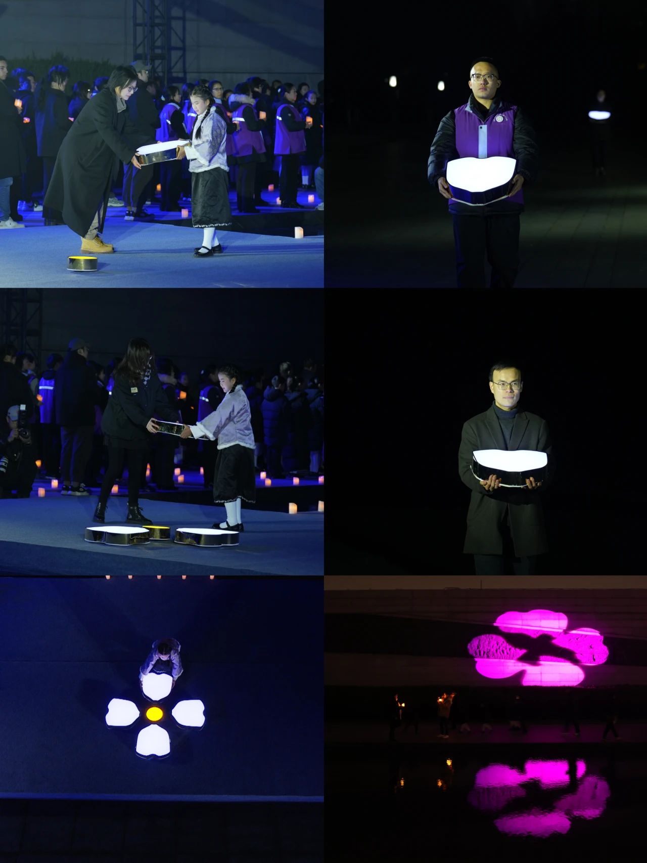 Accompanied by the children's singing, Ma Wenqian, representative of the historical memory inheritors of the Nanjing Massacre, Gaza Nyima, representative of the Zijin grass volunteers, Wang Jinglin, the representative of the medical staff from Drum Tower Hospital, and He Xu, the doctoral student representative from Nanjing University, set off one by one from under the Statue of the Goddess of Peace, slowly walking towards the location of the Zijin grass girl. The Zijin grass girl received the Zijin grass petal glowing props and placed them on the ground, until the final four glowing petals formed a large luminous pattern of Zijin grass, symbolizing how each small light will eventually merge into a dazzling galaxy. The Flower of Peace will bloom vigorously under the guardianship of collective efforts.