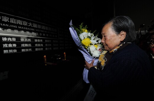 死难者遗属夏淑琴向南京大屠杀中遇难的亲人敬香并献花