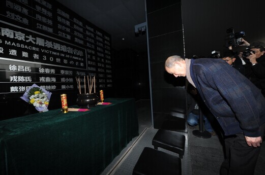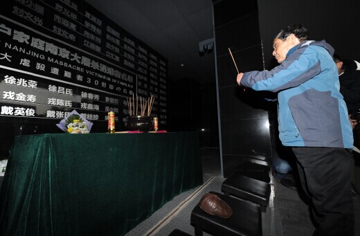 死难者遗属洪向才向在南京大屠杀中遇难的亲人敬香并献花