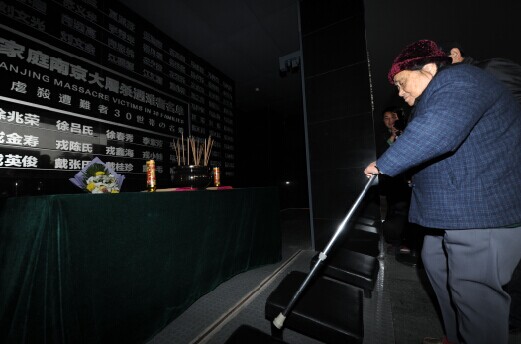 死难者遗属张惠霞向在南京大屠杀中遇难的亲人敬香并献花